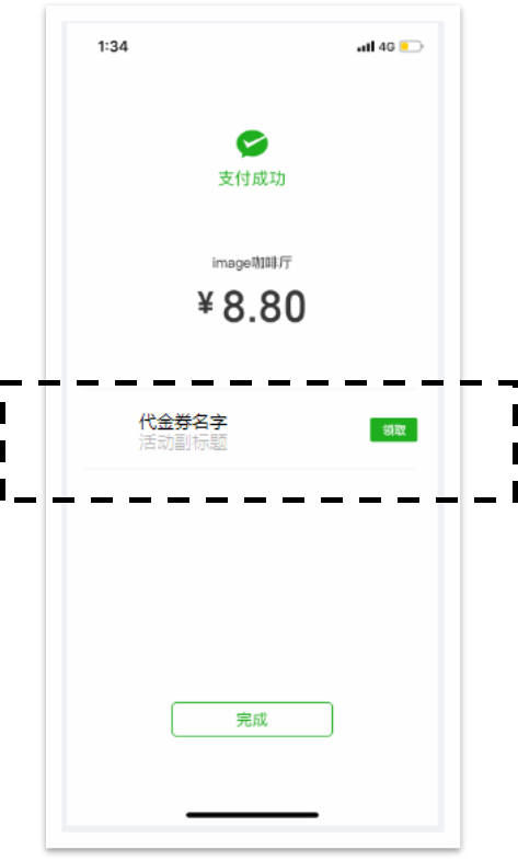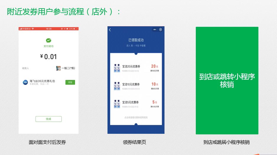 介绍:在门店周边面对面支付后发放商家代金券,领取后自动存入卡包/跳转小程序。