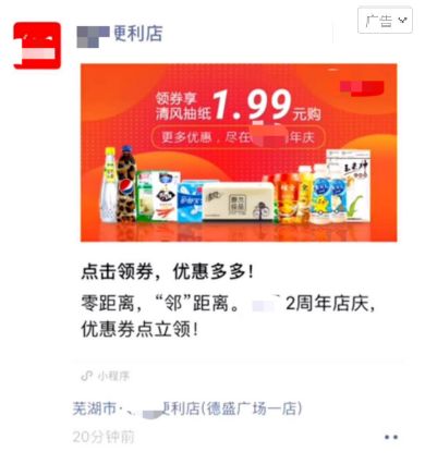 一个抽纸券作为朋友圈广告的钩子券,顾客点击朋友圈广告即可跳转至领券小程序,领券小程序内展示12张券。
