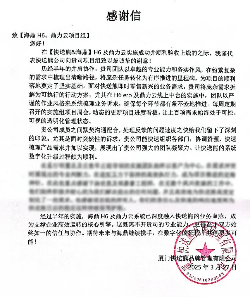 项目上线半年后,快送熊发来感谢信,信中提到:“千亿国际H6及鼎力云系统已经深度融入快送熊的业务血脉,成为支撑企业高效运转的核心引擎。”这一评价是对双方合作成果的高度认可。通过数智化赋能,快送熊实现了业务流程的重塑、店务操作的数智化移动化以及订单履约的高效化人性化,在拓店速度、品类覆盖、销售业绩等方面持续领先业内均值。